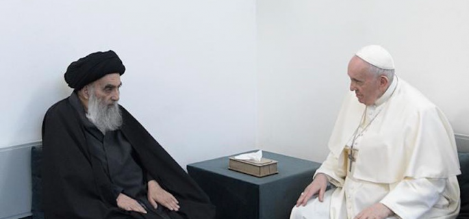 وأضاف “وقد كان اللقاء التاريخي الذي جمعه بالمرجع الديني الأعلى في النجف محطة فائقة الأهمية لتأكيد الطرفين على الدور الأساس للإيمان بالله تعالى وبرسالاته والالتزام بالقيم الأخلاقية السامية في التغلب على التحديات الكبيرة التي تواجهها الانسانية في هذا العصر، وضرورة تضافر الجهود في سبيل تعزيز ثقافة التعايش السلمي ونبذ العنف والكراهية، وتثبيت قيم التآلف بين الناس المبني على رعاية الحقوق والاحترام المتبادل بين معتنقي مختلف الأديان والاتجاهات الفكرية”.