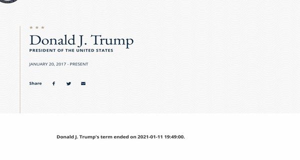 وجاء في صفحة السيرة الذاتية الرسمية لترامب أنّ “ولاية دونالد ج. ترامب انتهت في 11/1/2021 الساعة 19,49″، قبل أن تُحذف الصفحة ويُحال متصفّحوها إلى رسالة تفيد بحصول خطأ تقني، علما أنّ الموقع الإلكتروني للبيت الأبيض لم يشهد أي تعديل في ما يتعلّق بولاية الرئيس أو هويته.