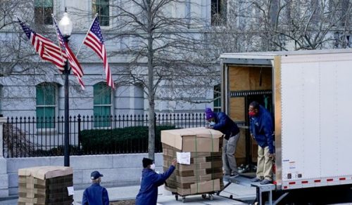 سلمت أكوام من الصناديق الكرتونية الفارغة إلى مبنى المكتب التنفيذي في البيت الأبيض لبدء حزم أمتعة الرئيس المنتهية ولايته دونالد ترامب ومسؤولي إدارته.