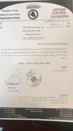 بالوثيقة …هيئة الاستثمار توجه المصارف استلام اقساط بسماية بسعر الصرف القديم