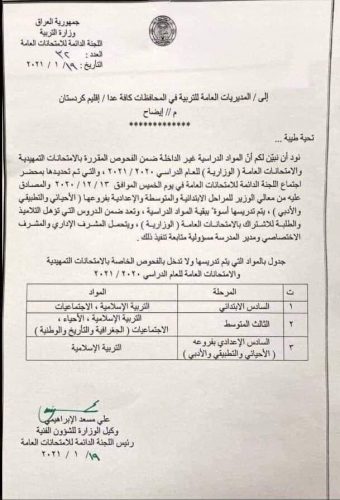 التربية تعلن المواد الدراسية غير الداخلة في الامتحانات الوزارية للمراحل المنتهية