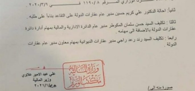 بالوثيقة.. وزير المالية يجري تغييرات في دائرة عقارات الدولة