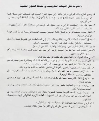بالوثائق.. التربية تُحدد ضوابط وآليات نقل الهيئات التعليمية والتدريسية الى معاهد الفنون الجميلة