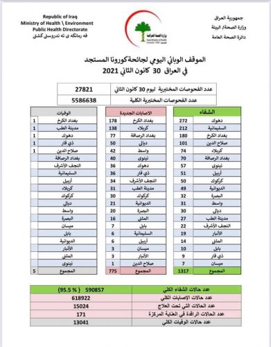 الصحة تسجل 775 اصابة جديدة بكورونا و5 حالات وفاة