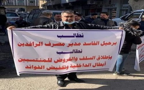 تظاهر عدد من الموظفين امام مقر الادارة العامة لمصرف الرافدين في بغداد للمطالبة باقالة مديره العام حسين علي محيسن بسبب رفضه اطلاق السلف لهم منذ ما يقارب ٦ اشهر.