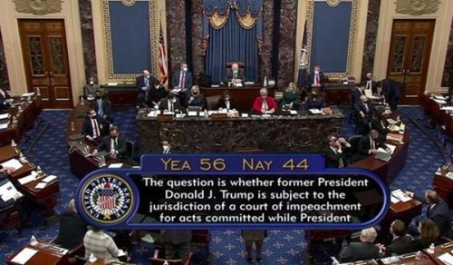وصوت 56 مشرعاً في مجلس الشيوخ، خلال جلسة التصويت، لصالح الاعتراف بأن محاكمة ترامب دستورية، مقابل رفض 44 سيناتوراً آخرين.