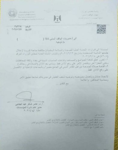 بالوثيقة .. الوقف السني يوجه بإغلاق الجوامع وقاعات المناسبات