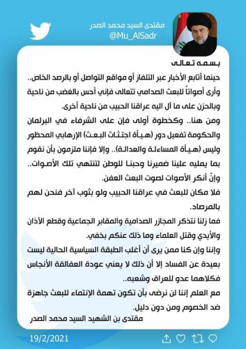 الصدر يطالب البرلمان والحكومة بتفعيل دور “هيأة اجتثاث البعث”