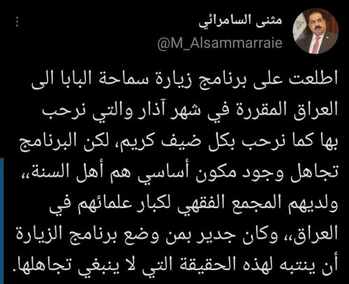 السامرائي: زيارة البابا للعراق تجاهلت المكون السني