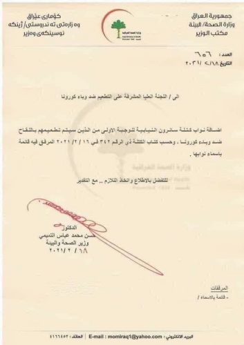بالوثيقة .. وزير الصحة يوافق على اضافة نواب “سائرون” الى الوجبة الاولى لتطعيمهم بلقاح كورونا