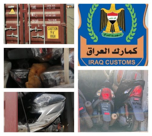 وذكرت الهيئة ، انها”ضبطت حاويتين تحتويان على دراجات نارية مخالفة في مركز كمرك ام قصر الشمالي”.