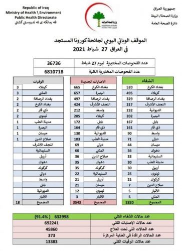 الصحة تسجل 3543 اصابة جديدة بفايروس كورونا