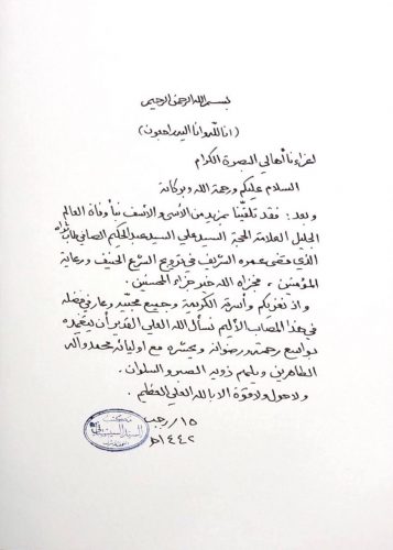 بالوثيقة .. مكتب السيستاني يعزي البصرة بوفاة علي الصافي