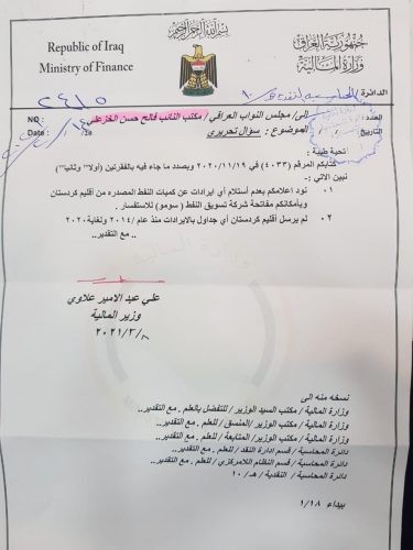 ووفقا لوثيقة مذيلة بتوقيع الوزير فإن إقليم كوردستان “لم يرسل أي جداول بالإيرادات منذ عام 2014 ولغاية 2020”.