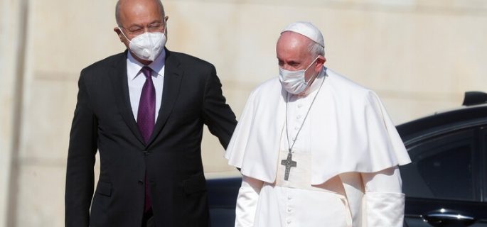 استقبل رئيس الجمهورية، برهم صالح، الاثنين، بابا الفاتيكان في مطار بغداد الدولي، تمهيدا للمغادرة.