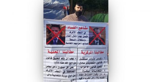 وقال مصدر إن “المتظاهرين يطالبون بإقالة الحكومة المحلية في النجف ومحاسبة المحافظين السابقين المتورطين بالفساد، بالإضافة الى محاسبة قتلة التظاهرين”.