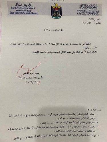 بالوثيقة.. الكاظمي يكلف نائباً من دولة القانون برئاسة مؤسسة الشهداء