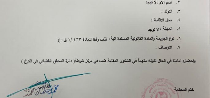 وصدرت المذكرة في يوم 16 من شهر آذار الجاري بتهمة “القذف”، وفقا للوثيقة الصادرة عن مجلس القضاء الأعلى.