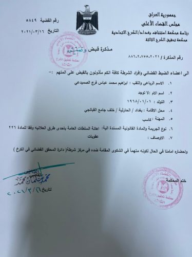بالوثيقة .. نص أمر القبض الصادر بحق ابراهيم الصميدعي