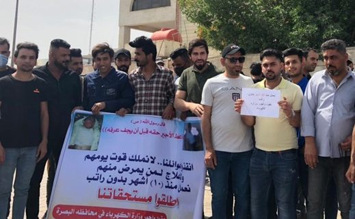تظاهر عدد من موظفي العقود والاجراء اليوميين في وزارة الكهرباء بمحافظة البصرة، الثلاثاء، للمطالبة بدفع مستحقاتهم المالية المتأخرة منذ اشهر عدة.