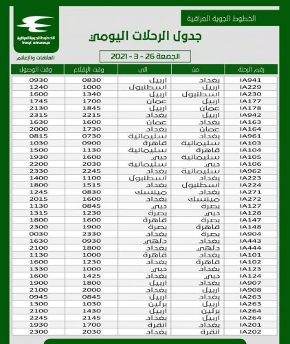 بالجدول.. الخطوط الجوية العراقية تعلن عن رحلاتها ليوم غد الجمعة