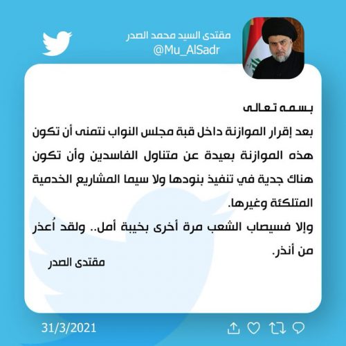 الصدر مغرداً عن إقرار الموازنة: لقد أعذر من أنذر