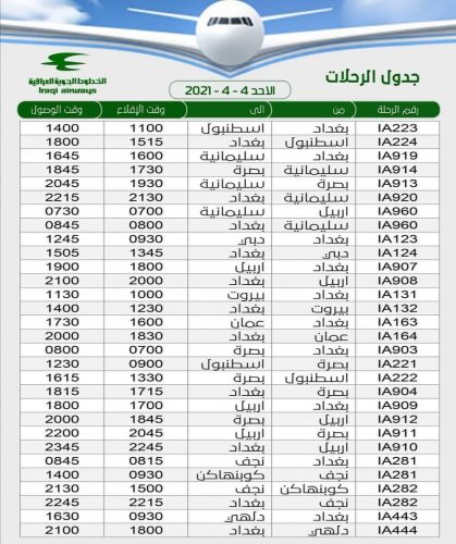 مواعيد رحلات الخطوط الجوية العراقية غدا الاحد