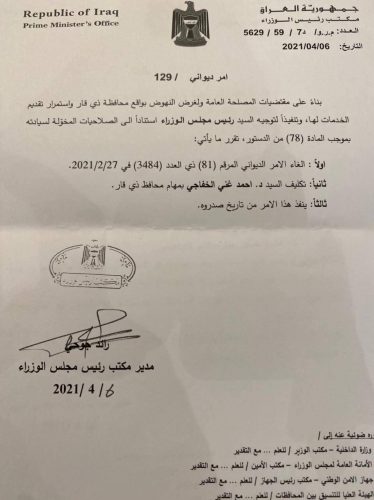 بالوثيقة ..تكليف الخفاجي محافظا لذي قار رسميا