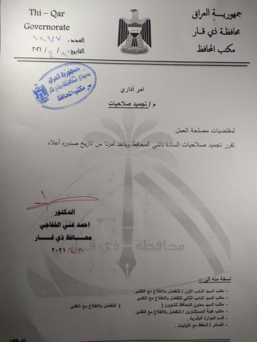 بالوثيقة.. محافظ ذي قار الجديد يجمد صلاحيات نائبيه