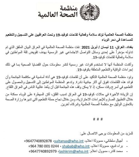 وأكدت المنظمة، في رسالتها، سلامة وفعالية لقاحات كوفيد-19، فيما حثت العراقيين على التسجيل والتطعيم.انتهى