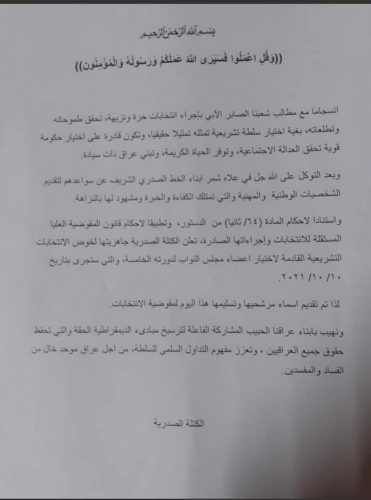 بالوثائق.. الكتلة الصدرية تسلم أسماء مرشحيها عن بغداد لمفوضية الانتخابات
