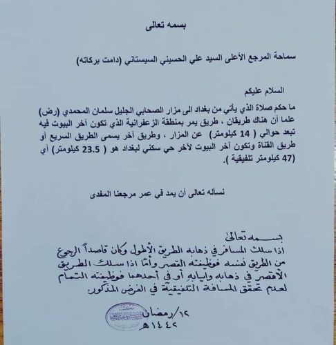 اجاب المرجع الاعلى السيد علي السيستاني على استفتاء جديد أوضح فيه طريقة احتساب المسافة الشرعية.