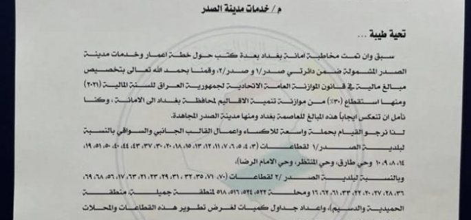 بالوثيقة.. رئاسة البرلمان تخاطب أمانة بغداد بشأن خدمات مدينة الصدر