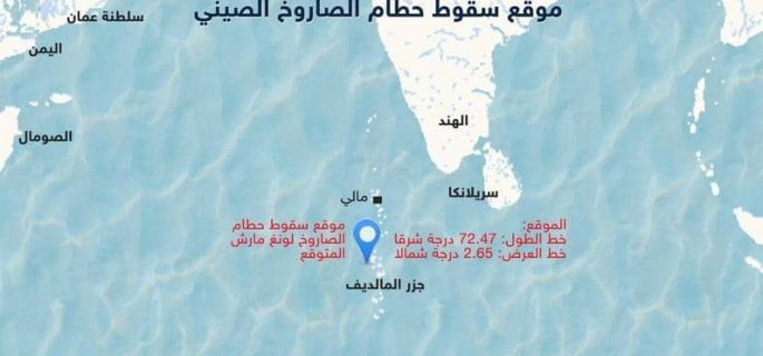 حددت الصين موقع سقوط حطام الصاروخ “لونغ مارش 5 بي”، ووضعت الإحداثيات التي تشير إلى سقوطه في مكان ما غربي جزر المالديف في المحيط الهندي.
