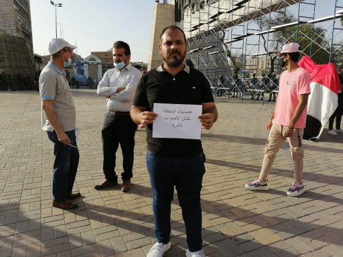 خرج العشرات، الاحد، بتظاهرة في ساحة التحرير وسط بغداد للتنديد باغتيال الناشط الكربلائي ايهاب الوزني.