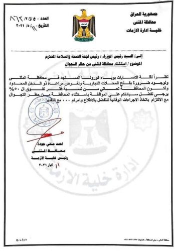 بالوثيقة.. محافظ المثنى يطالب اللجنة العليا استثناء المحافظة من قرار الحظر الشامل