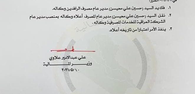 بالوثيقة .. وزير المالية يفك يد مدير مصرف الرافدين وينقله لمنصب جديد