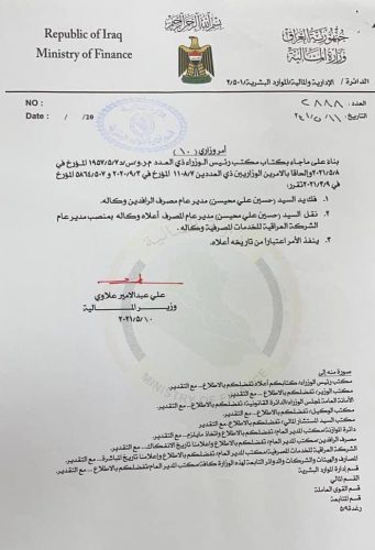 بالوثيقة .. وزير المالية يفك يد مدير مصرف الرافدين وينقله لمنصب جديد