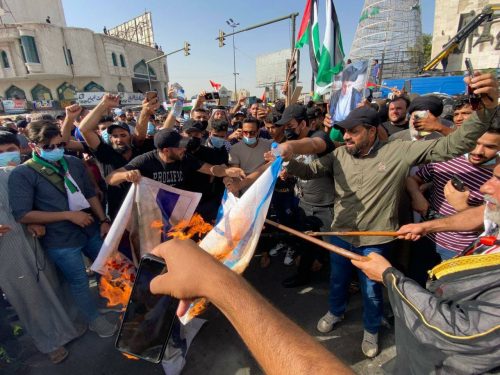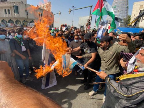 بالصور.. إحراق العلم الاسرائيلي والأميركي وسط العاصمة بغداد
