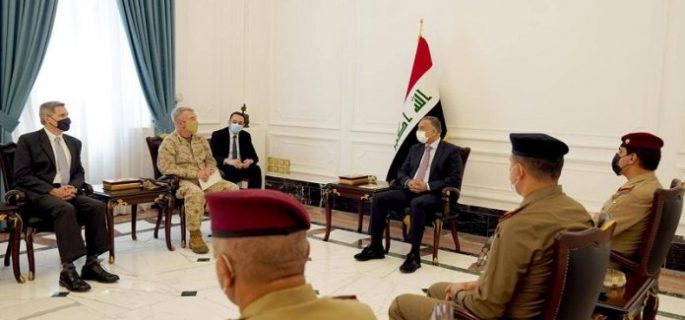اتفق رئيس مجلس الوزراء مصطفى الكاظمي، وقائد القيادة المركزية الأميركية الجنرال كينيث مكينزي، الخميس على وضع آليات تطبيق مخرجات الجولة الثالثة من الحوار الاستراتيجي بين العراق والولايات المتحدة، والمضي بسحب القوات المقاتلة للتحالف الدولي.