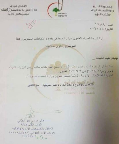 بالوثيقة.. الكاظمي يكلف وكيلاً لتسيير شؤون وزارة الصحة