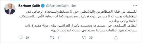 وقال صالح في تغريدة له ان “الكشف عن قتلة المتظاهرين والناشطين حق لا يسقط”، لافتا الى ان “استخدام الرصاص في التظاهرات يجب ان لا يمر من دون تحقيق ومحاسبة”.