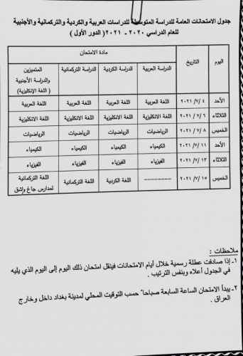 بالوثيقة.. التربية تعلن جدول الامتحانات النهائية للثالث المتوسط