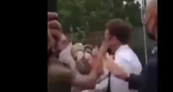 ونشر ناشطون مقطعا مصورا على وسائل التواصل، كما انتشر المقطع على وسائل إعلام محلية، ويظهر الرئيس الفرنسي وهو يتعرض إلى صفعة من أحد الأشخاص.