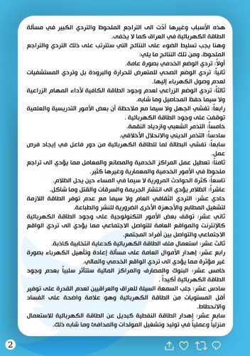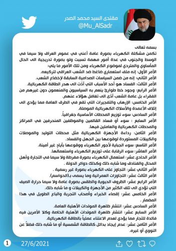 الصدر يحدد 20 سببا لمشكلة الكهرباء ويقدم الحلول