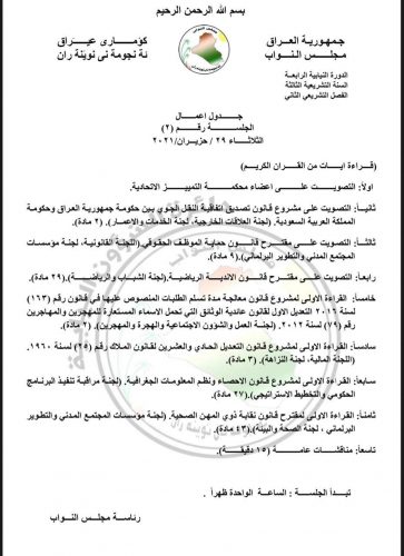 جدول اعمال جلسة البرلمان ليوم الثلاثاء المقبل