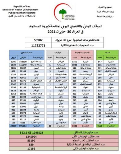الصحة تسجل 7300 اصابة جديدة بكورونا