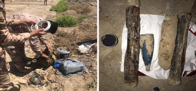 وتابع: “كما تمكنت قطعاتنا في اللواءين (55، 23) فرقة المشاة السابعة عشر من ‏ضبط كدس من العبوات الناسفة والمواد المتفجرة معدة لاستهداف المواطنين ‏الابرياء والبنى التحتية ضمن مناطق جنوب بغداد، احتوى على (4) عبــوات ‏ناسفة محلية الصنع مختلفة الاحجام والاشكـــال وعلب بلاستك (جلكانات) (10 ‏و20) لتر مملوءة بمواد شديدة الانفجار‏‎ (C4 ‎وكرات حديدية ) مع حشوة مدفعية ‏واحدة واسلاك وقداحات تفجير وهي من مخلفات عصابات داعش الإرهابية”، ‏مؤكداً أنه “تم رفعها بدون حادث”.‏انتهى