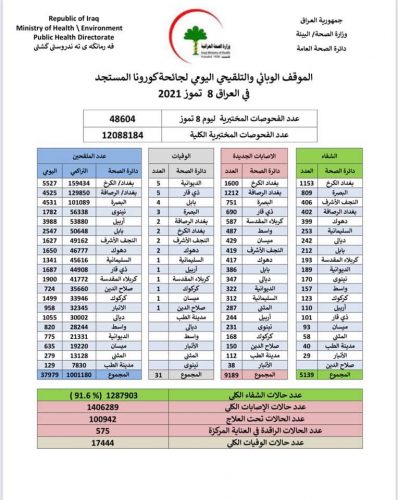 الصحة تسجل اكثر من 9000 إصابة جديدة بكورونا