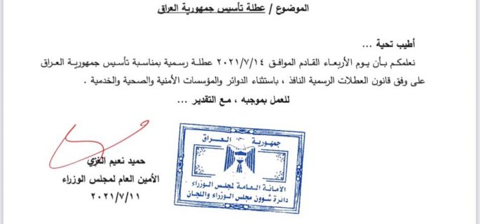 بالوثيقة : العراق يعطل الدوام الرسمي يوم الأربعاء المقبل